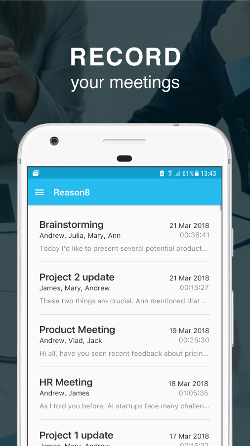 Since there was no actual formal meeting taking place when we tested the app, I put two devices about 18 inches apart and spoke into each of them back and forth. This mimicked how audio would be captured by each device if an actual discussion with several people took place. The results were outstanding. Reason8 makes use of Google Speech To Text engine but combines that with their own proprietary technology which improves accuracy. Reason8 states that their accuracy rate clocks in at about 96%, for us it was closer to 100% as long as we spaced devices accordingly. Otherwise, crosstalk will make it so it appears as if one person was contributing to the conversation for the whole session.